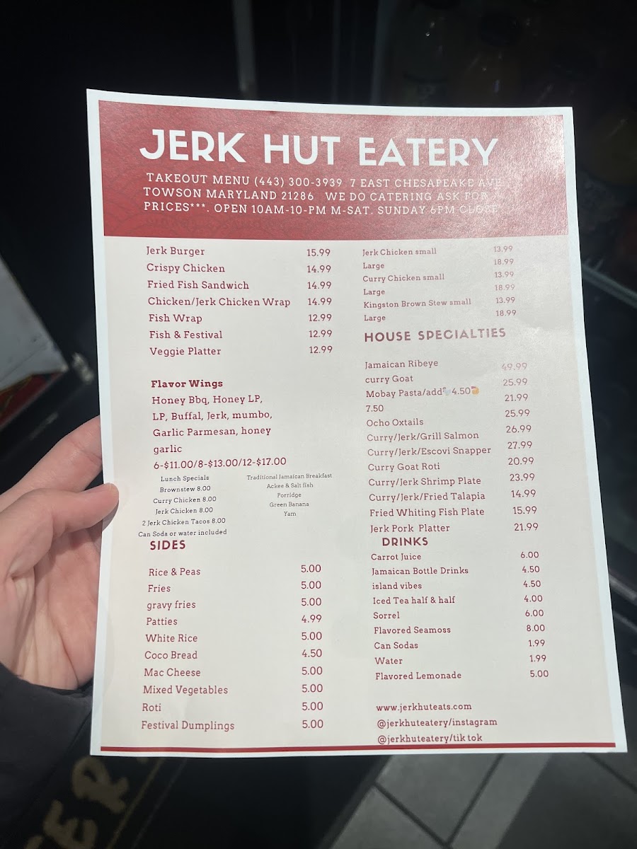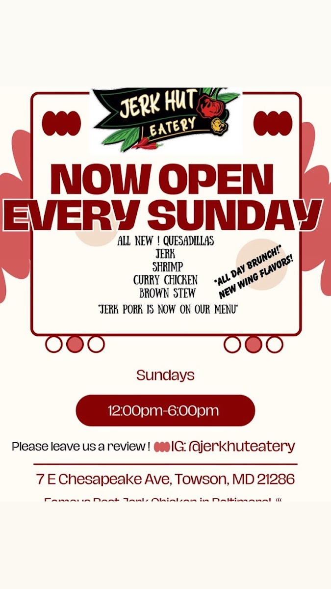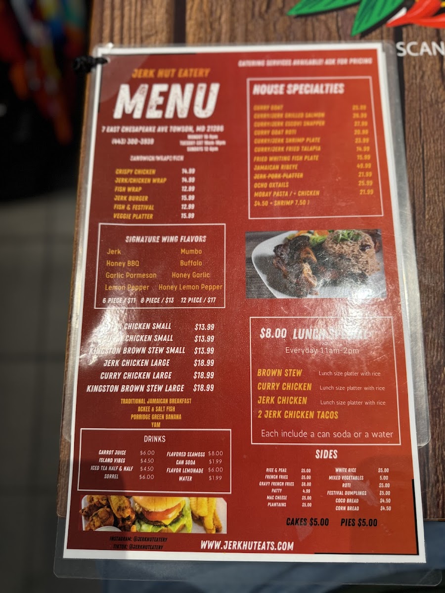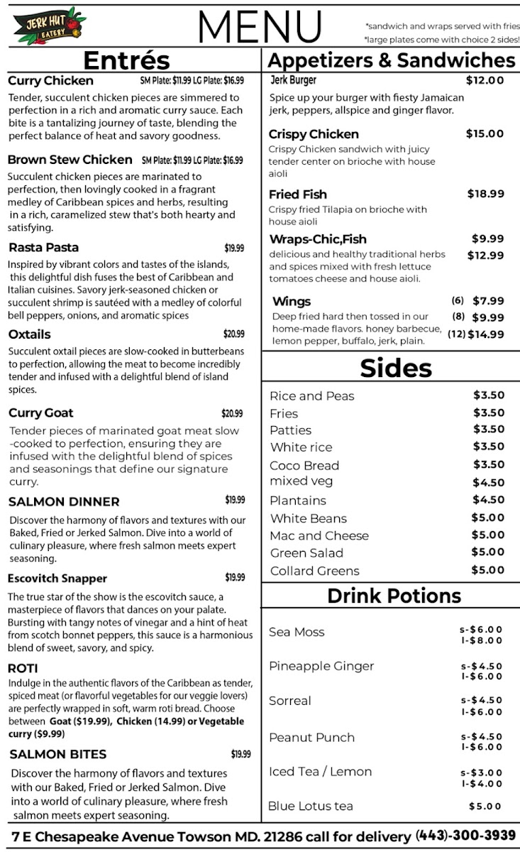 If you're in the mood for bold, flavorful dishes, look no further than the Jerk Hut Eatery Menu. Nestled in Towson, MD, this eatery brings the vibrant tastes of the Caribbean right to your plate. Whether you're craving a smoky jerk chicken with a perfect balance of spices or a tender oxtail stew, there's something here to satisfy every palate. Their menu features hearty comfort foods like rice and peas, plantains, and savory sides, all prepared with care and the right touch of seasoning. Each dish reflects the essence of island cooking, offering a burst of flavor in every bite. With a laid-back, welcoming atmosphere, it’s the ideal spot for a casual meal with friends or a quick takeout when you're on the go. If you're new to the menu, don't miss the signature jerk dishes - they're the heart and soul of the experience.
